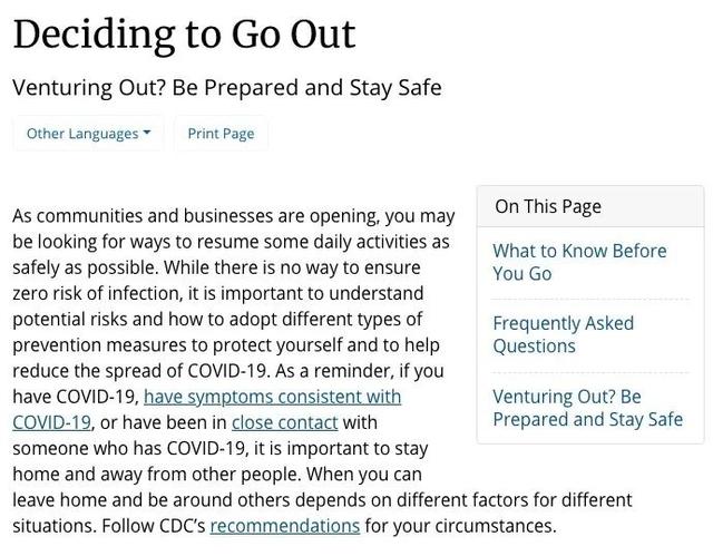 当地时间6月12日(周五),美国疾控中心 (CDC) 召开线上发布会,并公开发布了关于恢复正常活动、举办和参加各种集会的“决定外出 (Deciding to Go Out)”指南。