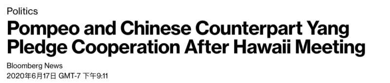 当地时间6月17日,美国国务卿迈克·蓬佩奥(Mike Pompeo)与中共中央政治局委员、中央外事工作委员会办公室主任杨洁篪在夏威夷举行对话。双方就中美关系和共同关心的国际与地区问题深入交换了意见。