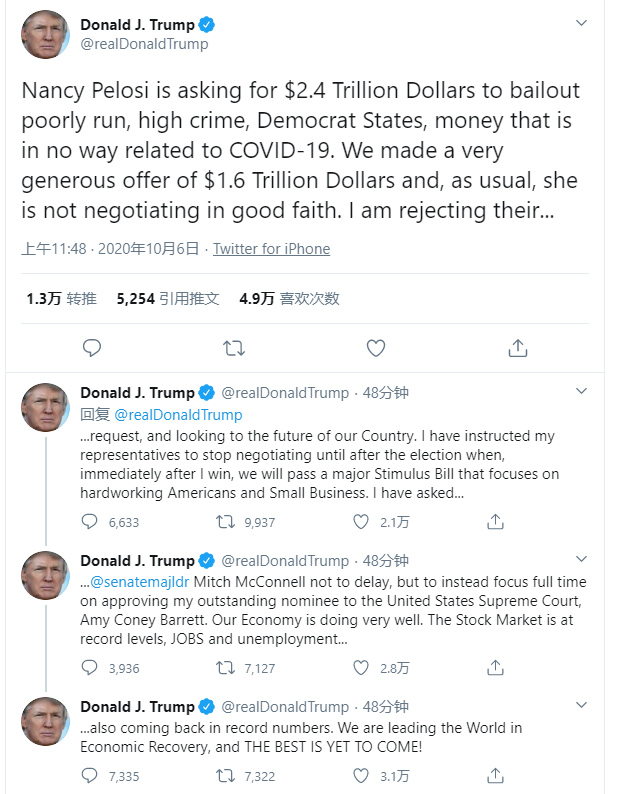当地时间10月5日,特朗普总统宣布针对第二轮的经济刺激方案的谈判将持续到大选之后,并命令财政部长史蒂芬·姆努钦(Steven Mnuchin)停止与众议院议长南希·佩洛西(Nancy Pelosi)进行谈判。