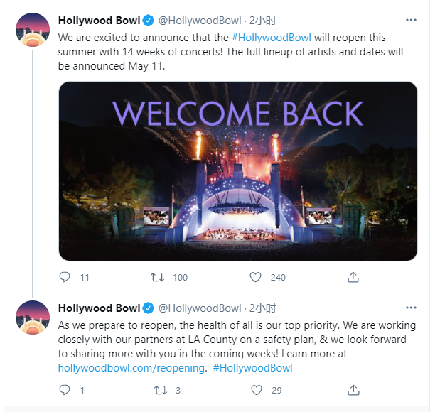洛杉矶爱乐乐团 (Los Angeles Philharmonic)周五宣布,经过一年的关闭后,好莱坞碗将在五月重新开放,为一线工人免费举办音乐会。