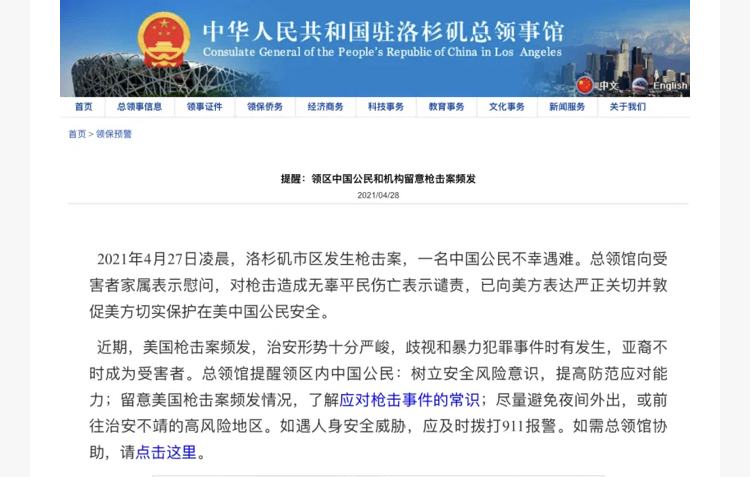 2021年4月27日凌晨,洛杉矶市区发生枪击案,一名中国公民不幸遇难。中国驻洛杉矶总领馆向受害者家属表示慰问,对枪击造成无辜平民伤亡表示谴责,并已向美方表达严正关切并敦促美方切实保护在美中国公民安全。