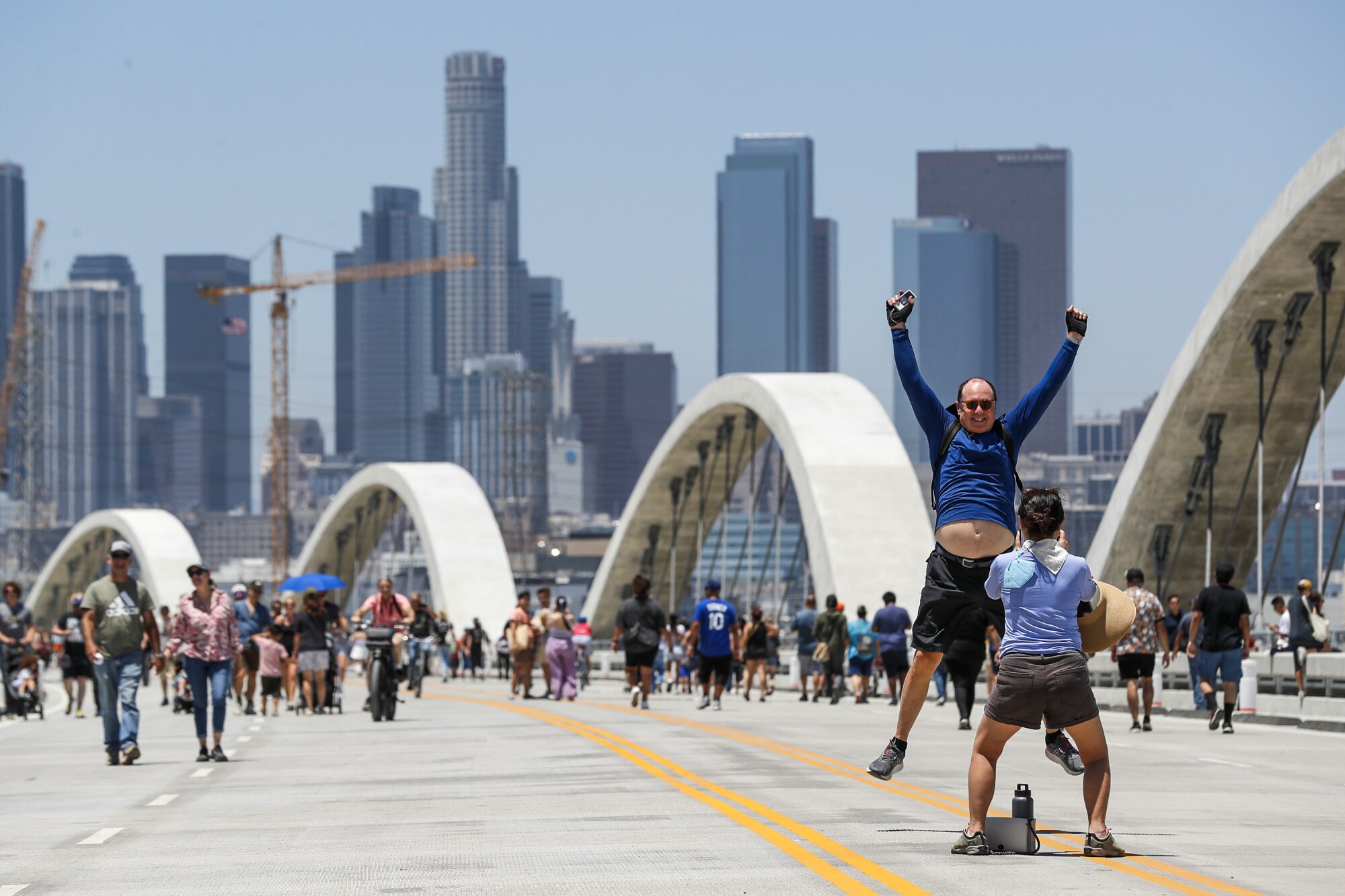7月9日(周六),成千上万的南加州居民出来庆祝第六街大桥的开通。据卡尔弗城居民洛里斯·索托(Lorise Soto)说,这座连接东区和市中心的桥正在“创造历史”。索托说,她来参加庆祝活动“是为了和每个人在一起,看看发生了什么,并亲身体验。”